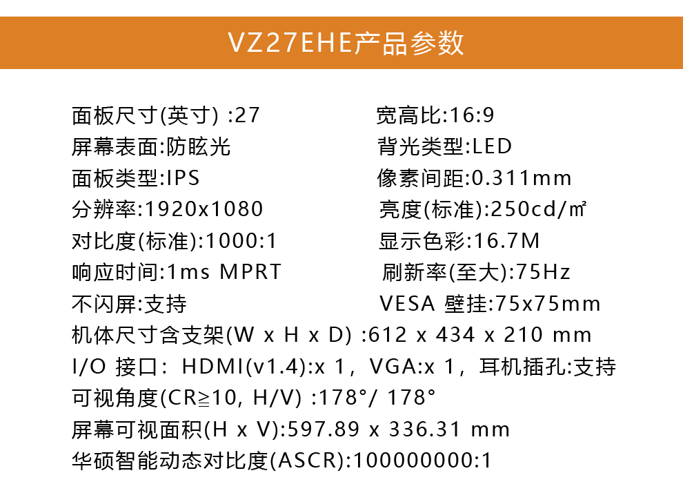 • 商品名称:华硕 VZ27EHE 27英寸 全高清 窄边IPS屏 液晶显示器 电脑显示器