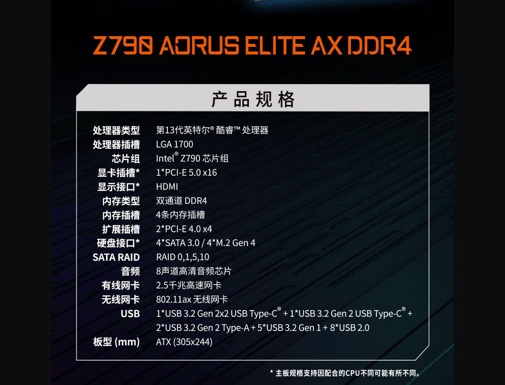 • 商品名称:技嘉(GIGABYTE)Z790 AORUS ELITE AX D4小雕 支持DDR4 英特尔13代CPU处理器