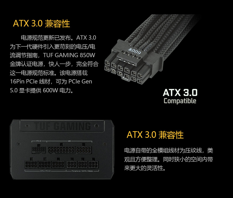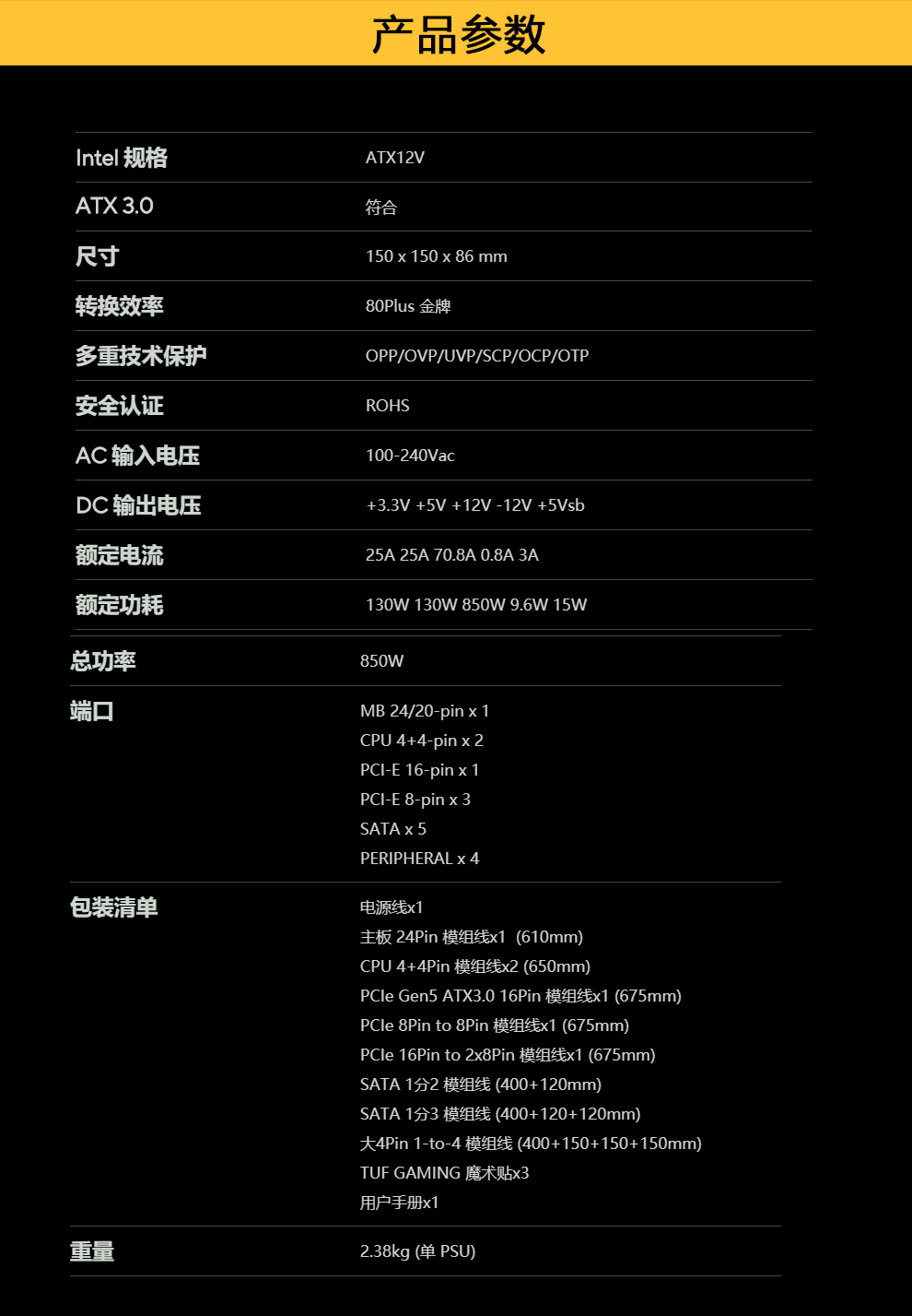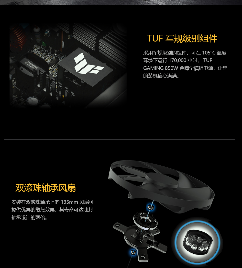 • 商品名称:华硕(ASUS)TUF-GAMING-850G 额定850W 台式机金牌电源