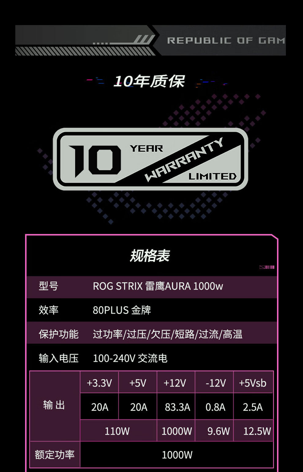 • 商品名称:华硕(ASUS)雷鹰AURA ROG-STRIX-1000G-AURA-GAMING电源