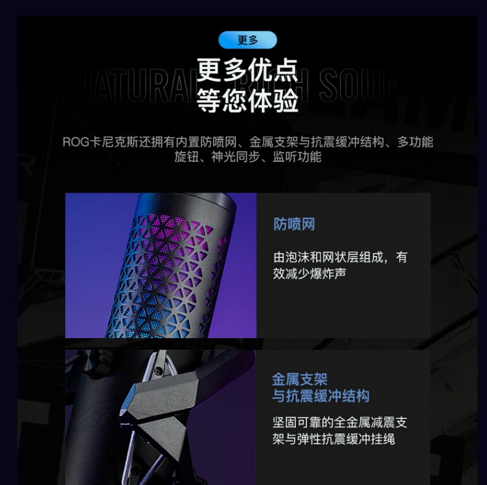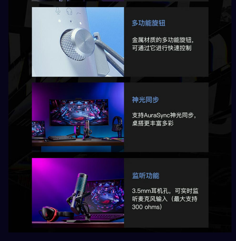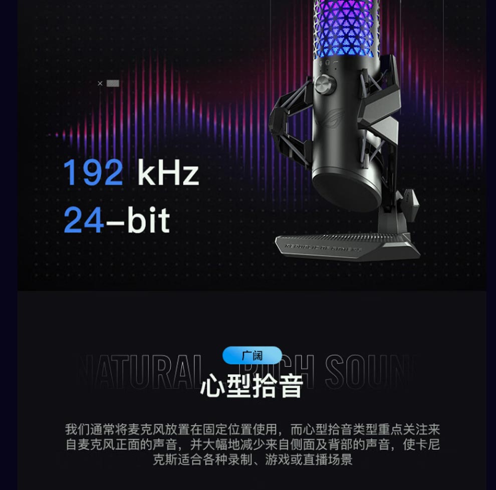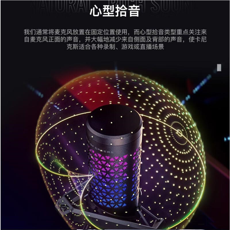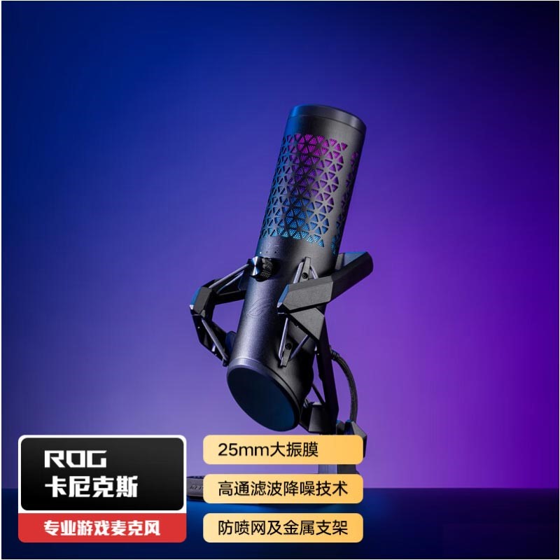 • 商品名称:ROG卡尼克斯专业麦克风 桌面麦克风直播设备唱歌专用麦克风全民k歌神器专业主播高通滤波降噪RGB黑色