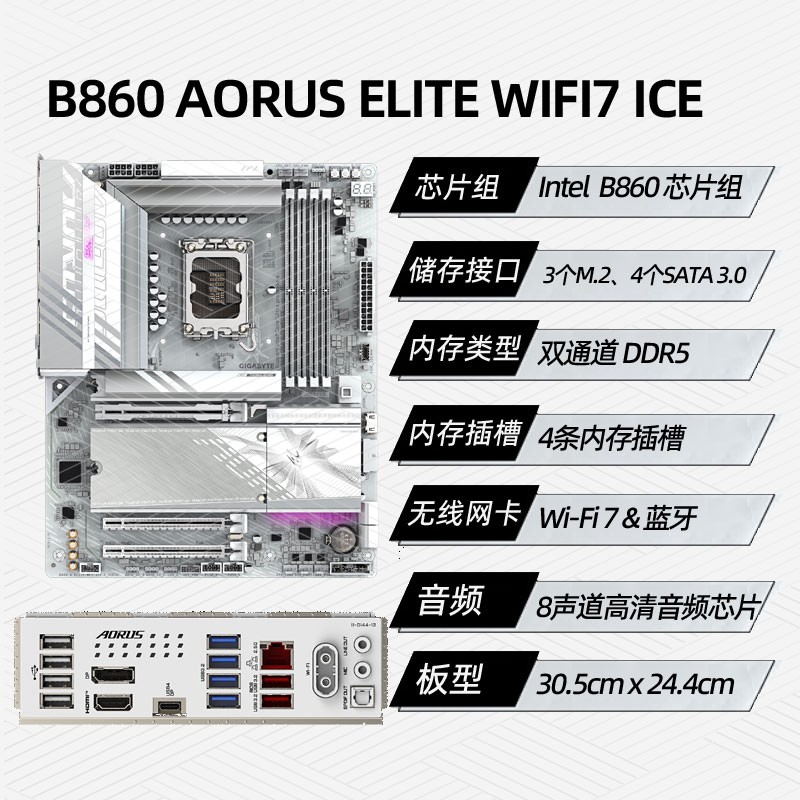 • 商品名称:技嘉(GIGABYTE)B860 AORUS ELITE WF7 ICE主板 (Intel B860/LGA 1851)