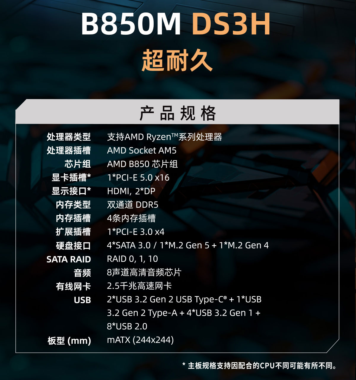 • 商品名称:技嘉(GIGABYTE)B850M DS3H主板 (AMD B850/socket AM5)