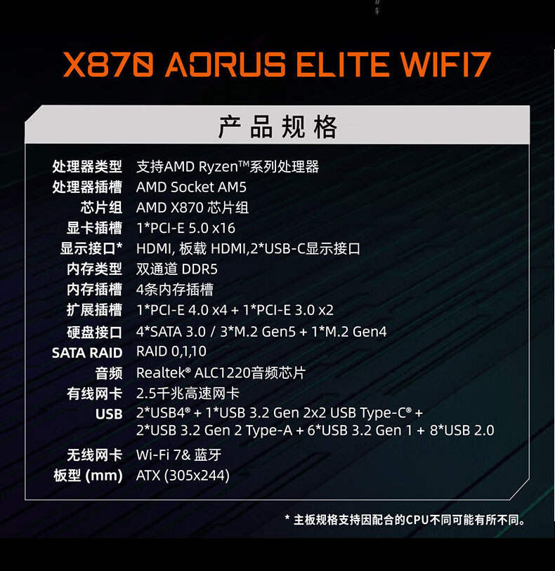 • 商品名称:技嘉(GIGABYTE)X870 AORUS ELITE WIFI7主板