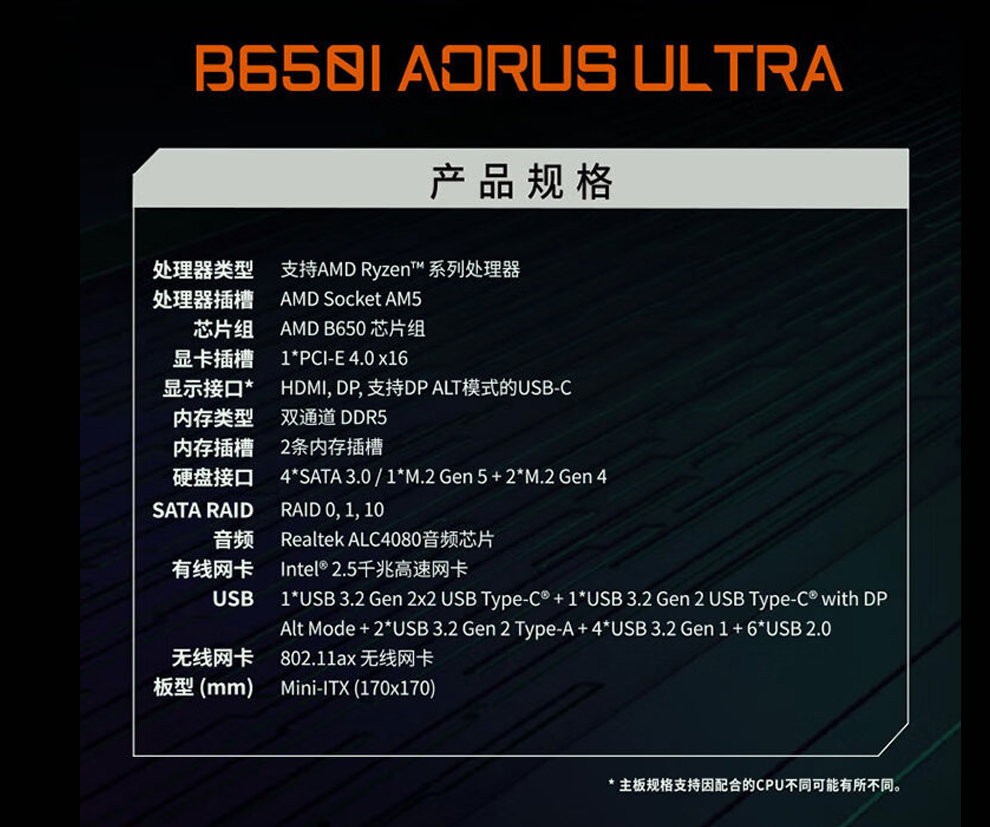 • 商品名称:技嘉(GIGABYTE)主板B650I AORUS ULTRA主板