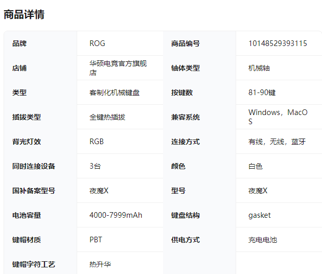 • 商品名称:华硕 ROG ZAOTH夜魔X 雪武白轴 键盘