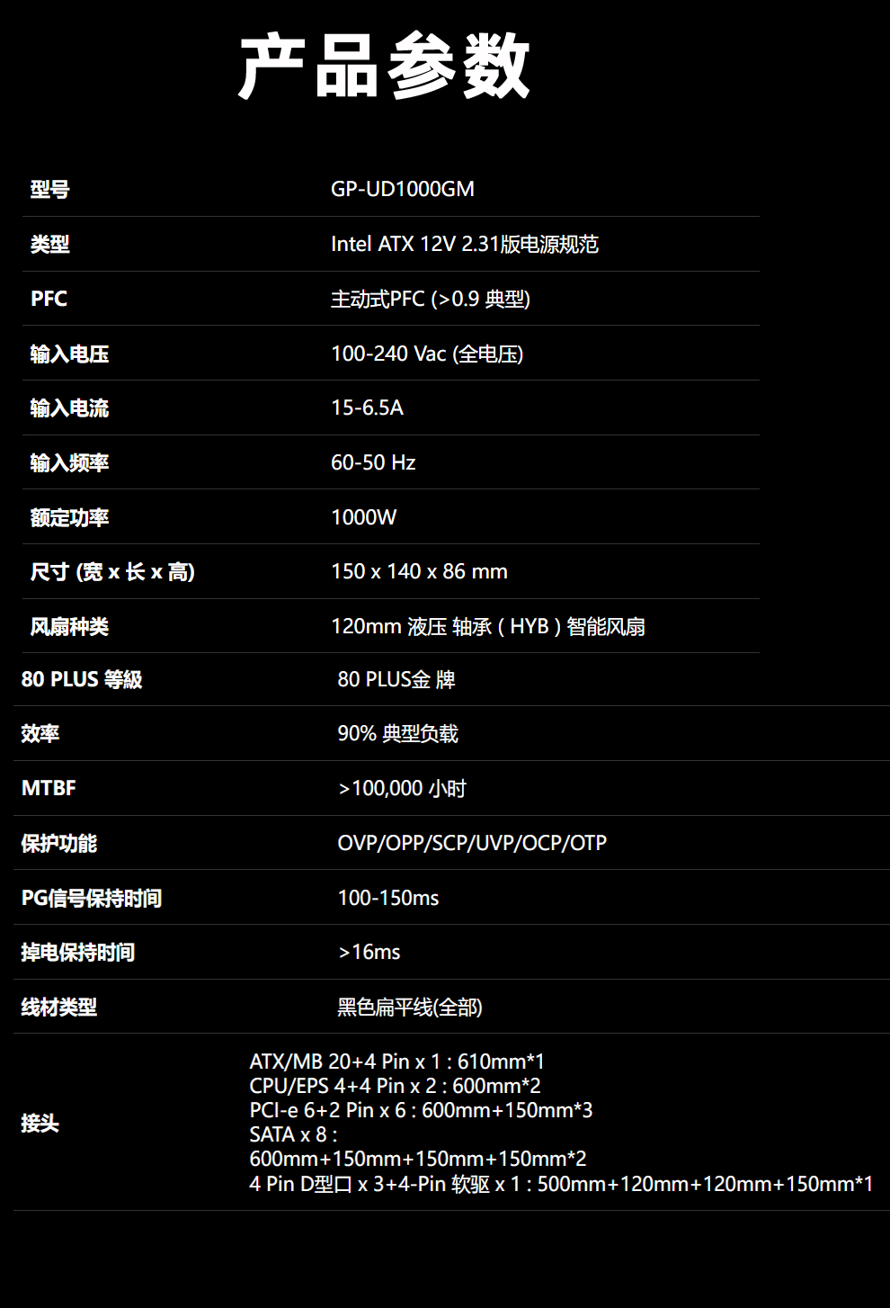 • 商品名称:技嘉(GIGABYTE)猎鹰1000GM GP-UD1000GM 电源