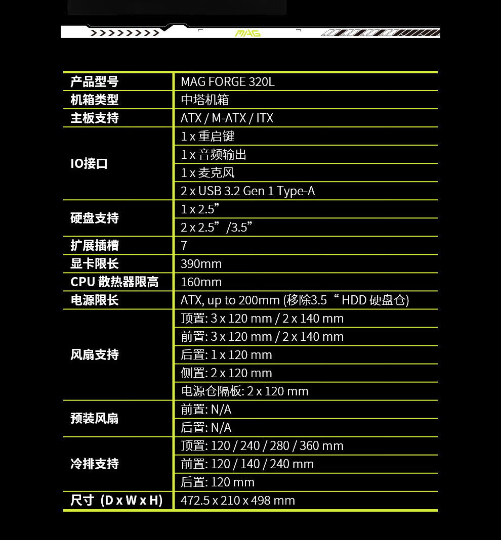 • 商品名称:微星(MSI) MAG FORGE 320L 战斧 3 机箱
