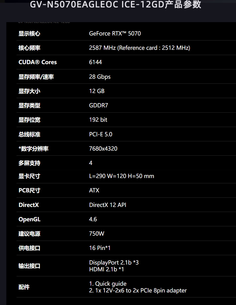• 商品名称:技嘉(GIGABYTE)N5070EAGLEOC ICE-12GD 冰猎鹰
