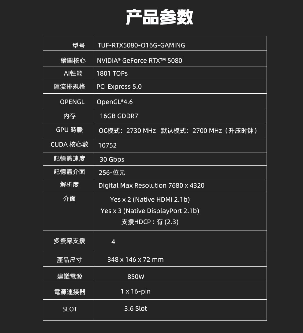 • 商品名称:华硕(ASUS)TUF-RTX5080-O16G-GAMING