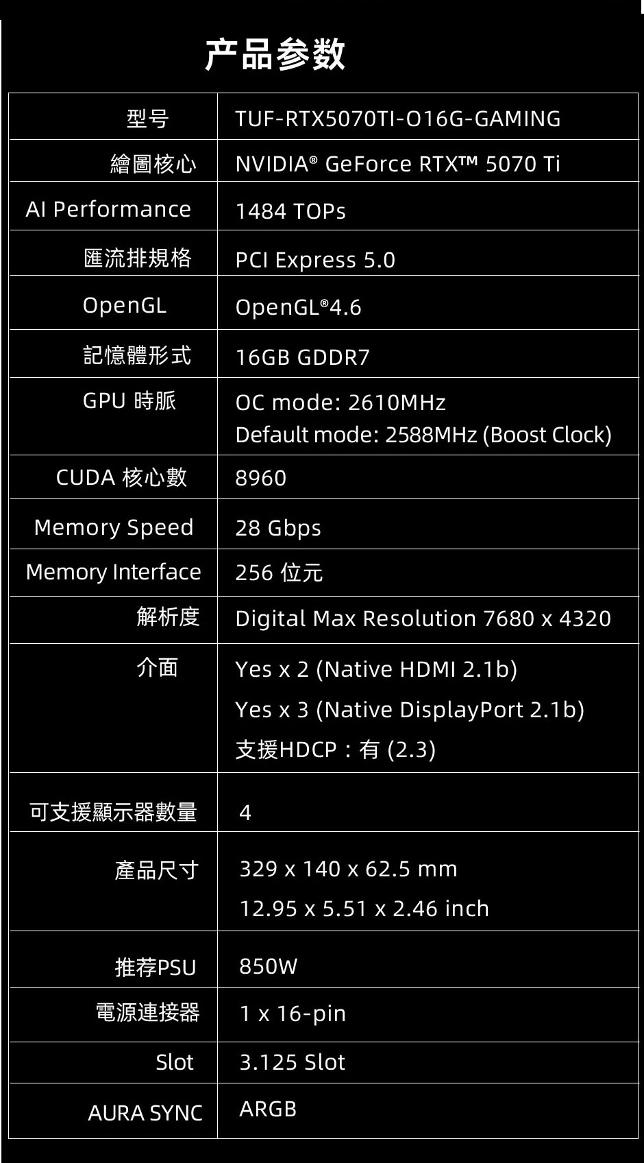 • 商品名称:华硕(ASUS)TUF-RTX5070TI-O16G-GAMING