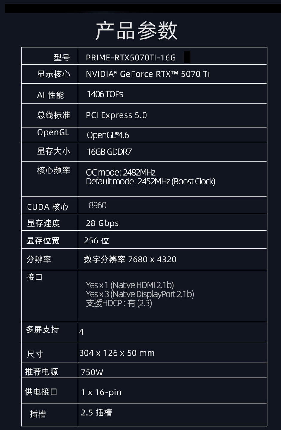 • 商品名称:华硕(ASUS)PRIME-RTX5070TI-16G (非O)( SFF)2.5宽