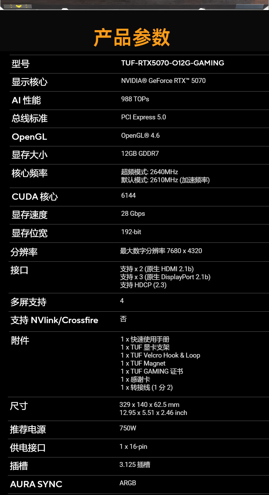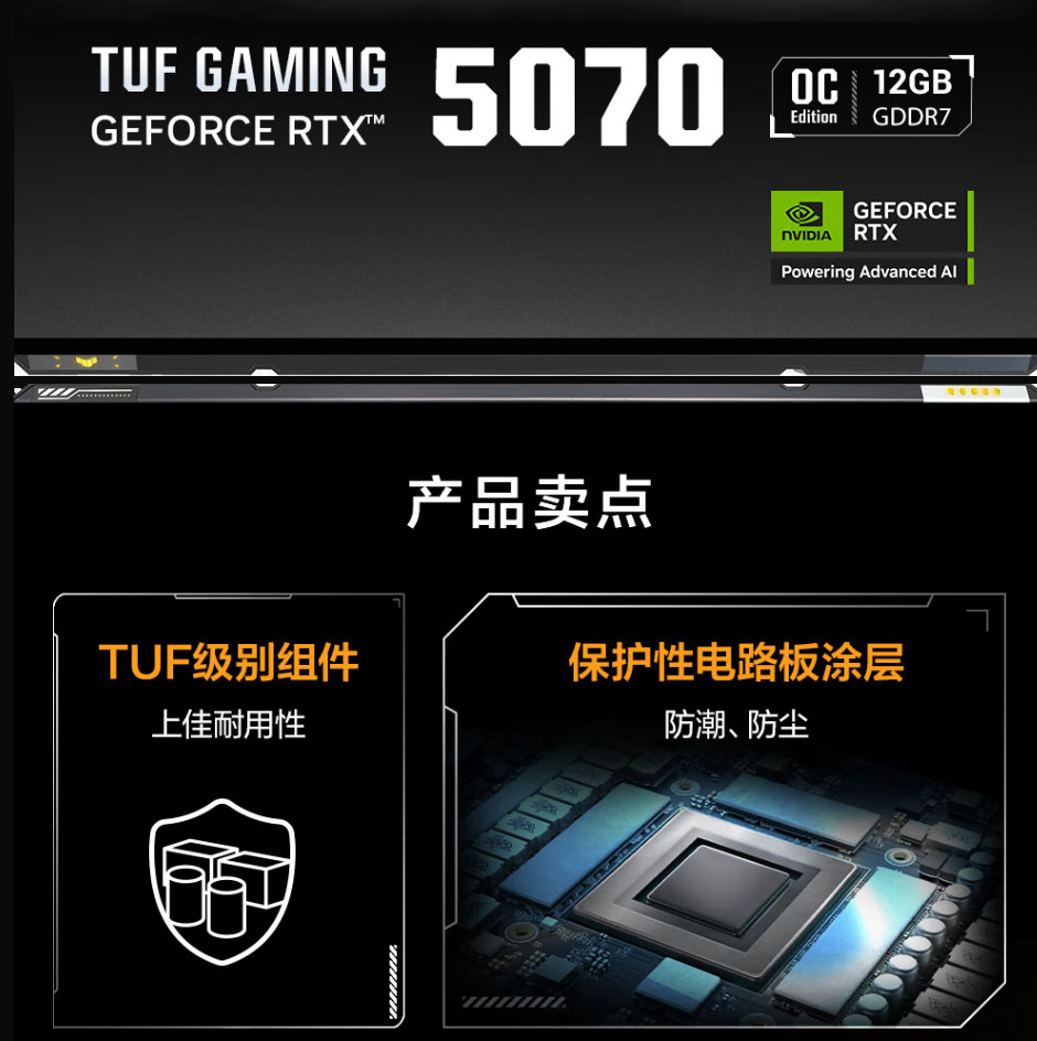 • 商品名称:华硕(ASUS)TUF-RTX5070-O12G-GAMING