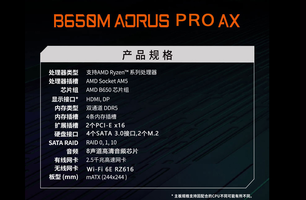 • 商品名称:技嘉(GIGABYTE)B650M AORUS PRO AX小雕Pro 台式机电脑主板支持1718针AMD处理器