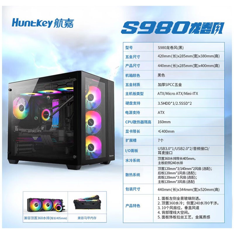 • 商品名称:航嘉(Huntkey) S980龙卷风 全景侧透钢化玻璃 游戏机箱 -黑色