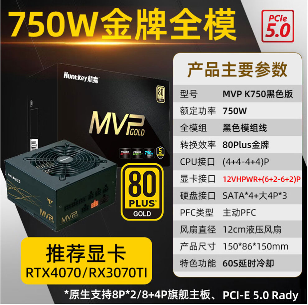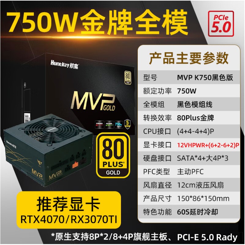 • 商品名称:航嘉(Huntkey)电源MVP K750金牌-全模组PCI-E5.0黑色