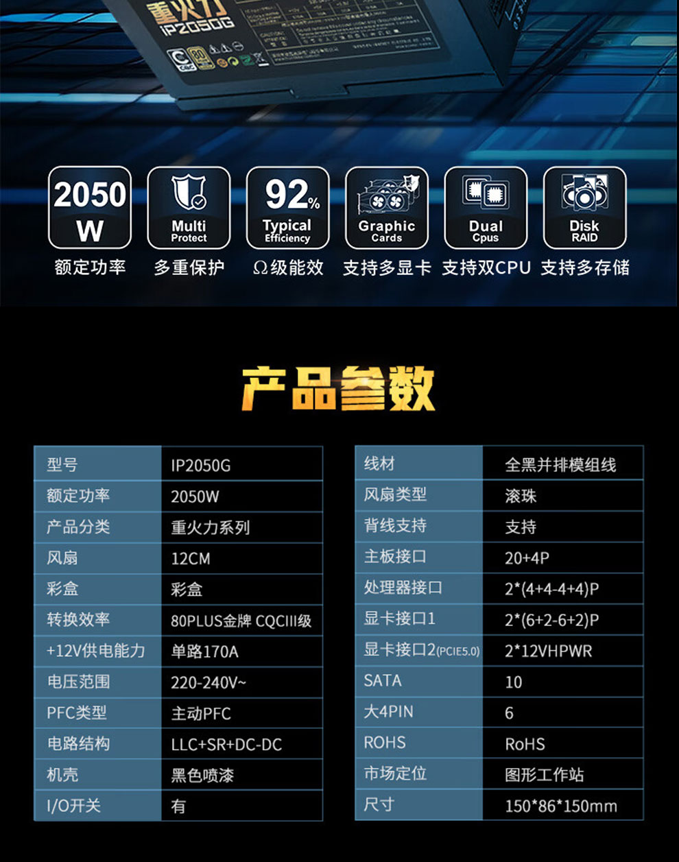 • 商品名称:航嘉(Huntkey)重火力IP2050G ATX3.0 PCI E5.0 80PIUS认证金牌全模组台式机电脑电源