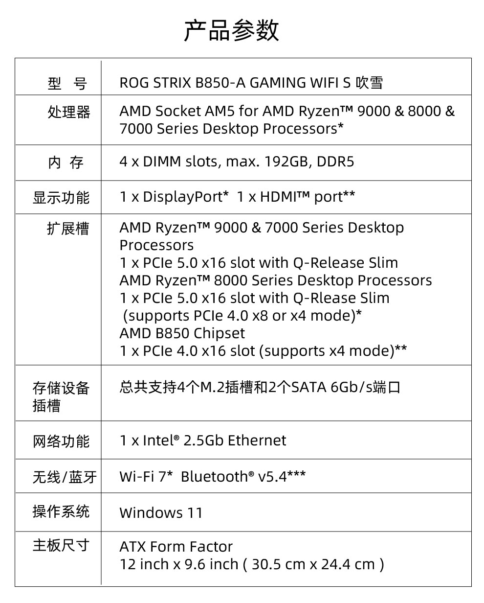 • 商品名称:华硕ROG STRIX B850-A GAMING WIFI S 吹雪主板