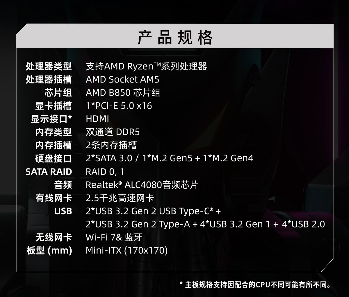 • 商品名称:技嘉(GIGABYTE)B850I AORUS PRO 主板迷你ITX (AMD B850/socket AM5)