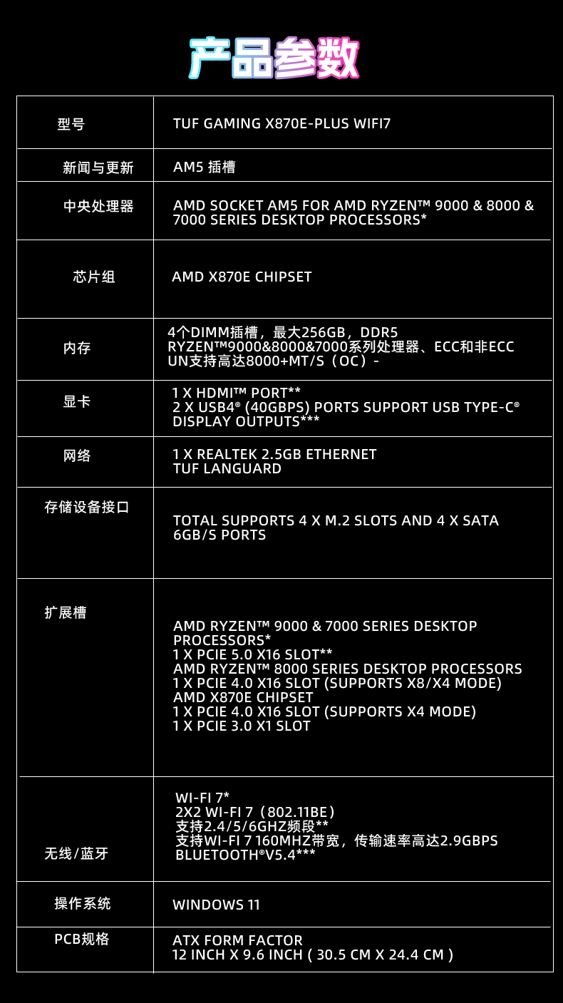 • 商品名称:华硕TUF GAMING X870E-PLUS WIFI7主板