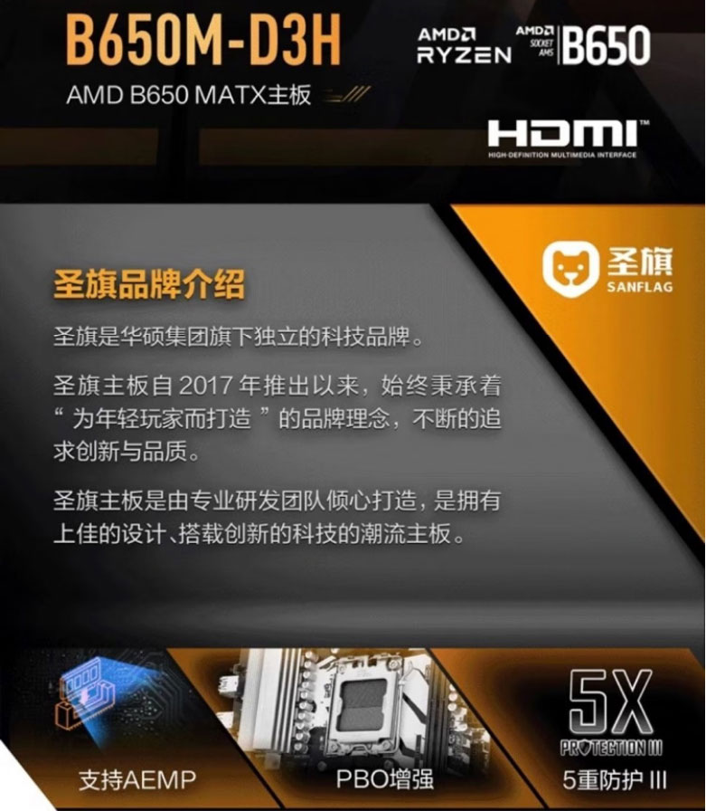 • 商品名称:圣旗B650M-D3H 主板 新品