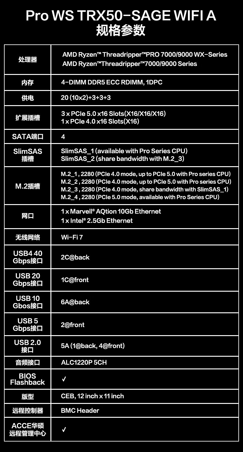 • 商品名称:华硕PRO WS TRX50-SAGE WIFI A 工作站主板