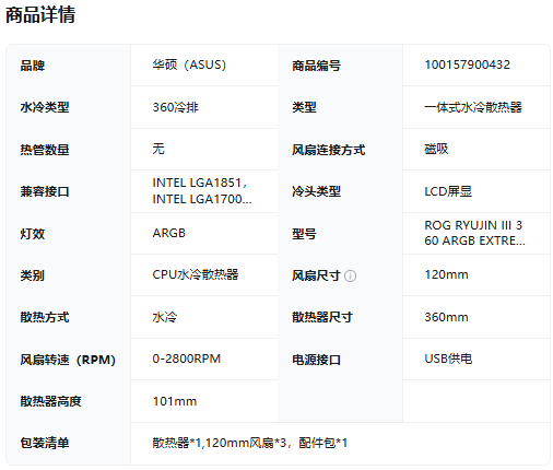 • 商品名称:华硕(ASUS)龙神 ROG RYUJIN III 360 ARGB EXTREME 白色 散热器