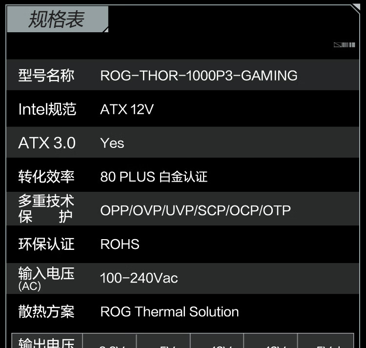 • 商品名称:华硕(ASUS)雷神三代 ROG-THOR-1000P3-GAMING 电源